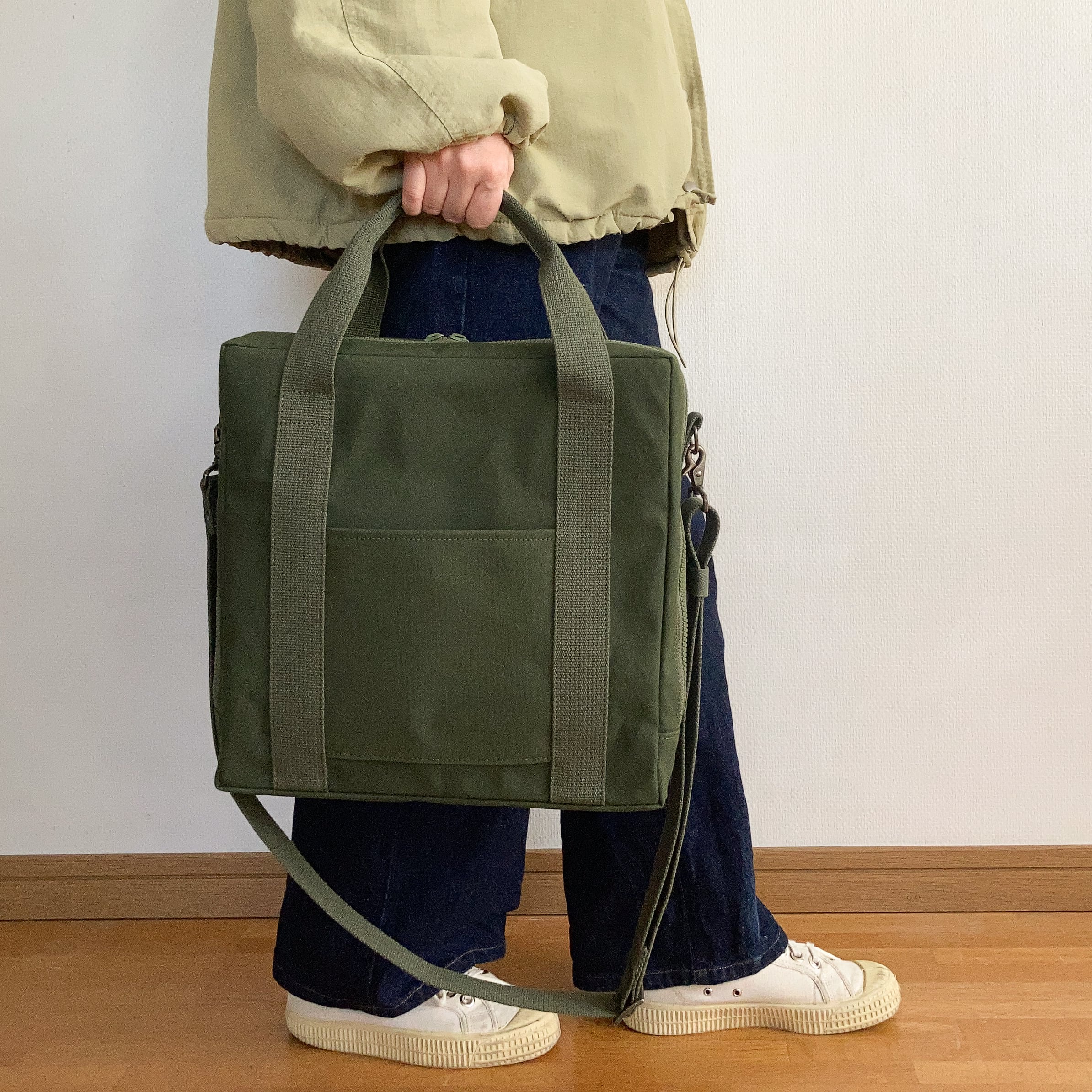 aoya bags定番のオリーブドラブカラーのシリーズにスクエア2wayショルダーが加わりました。