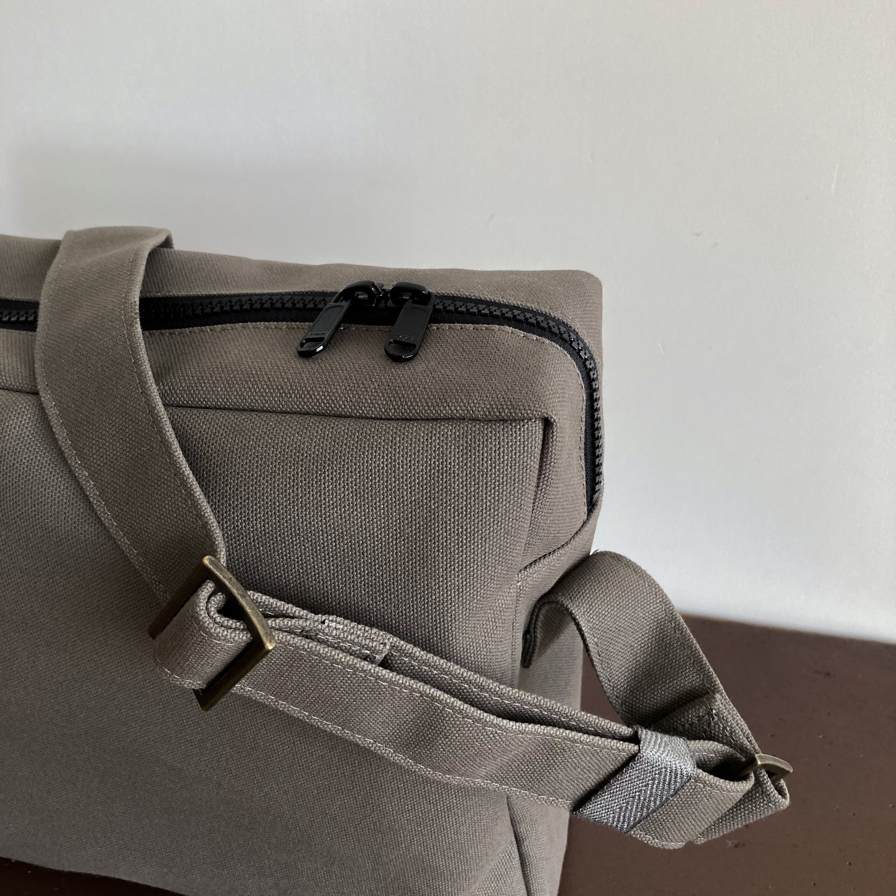 素材は8号の弱撥水加工帆布で厚手のしっかりとした帆布です。ざっくりとした帆布らしい質感で製作時に生じるシワが加工帆布の独特の雰囲気を醸し出します。使い続けていただくにつれてより馴染んでいきます。