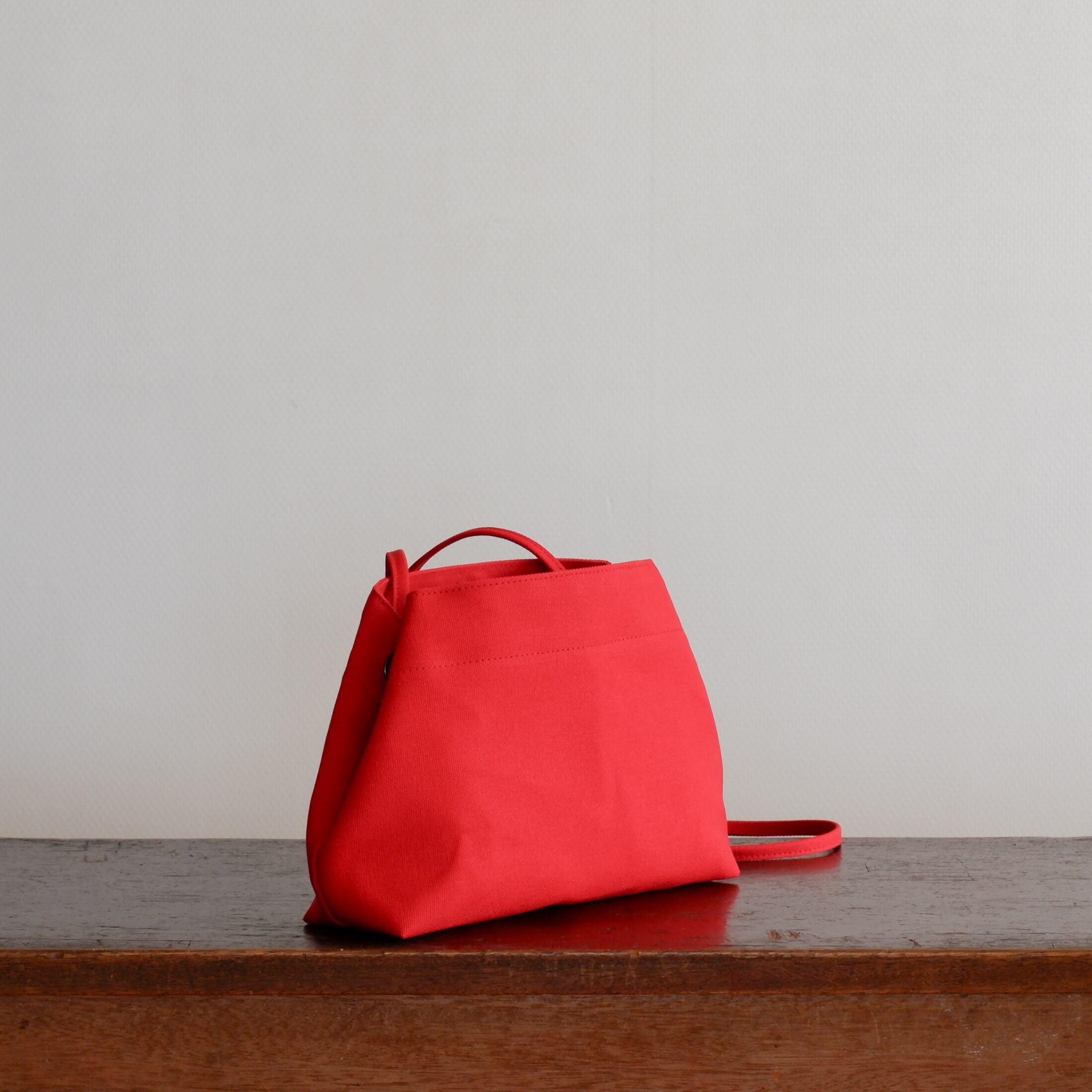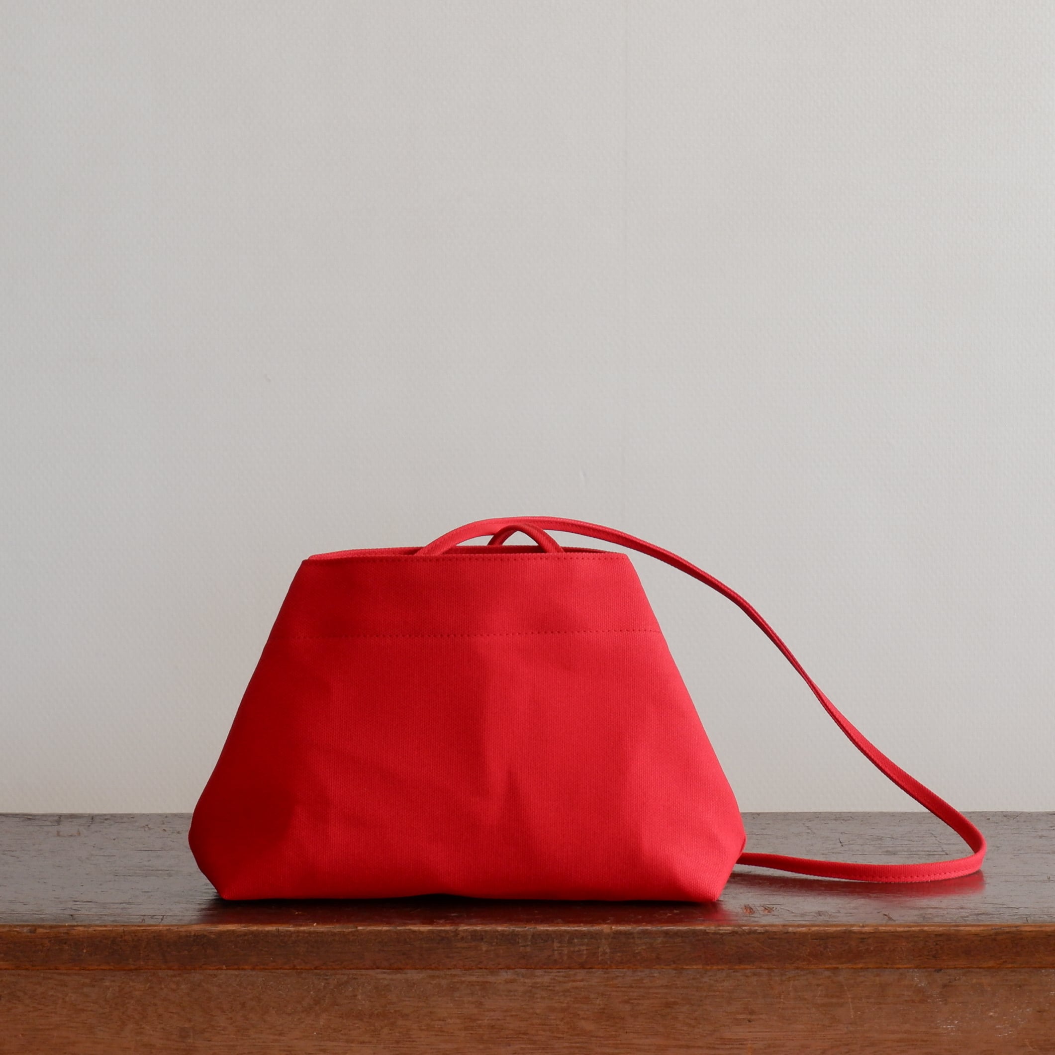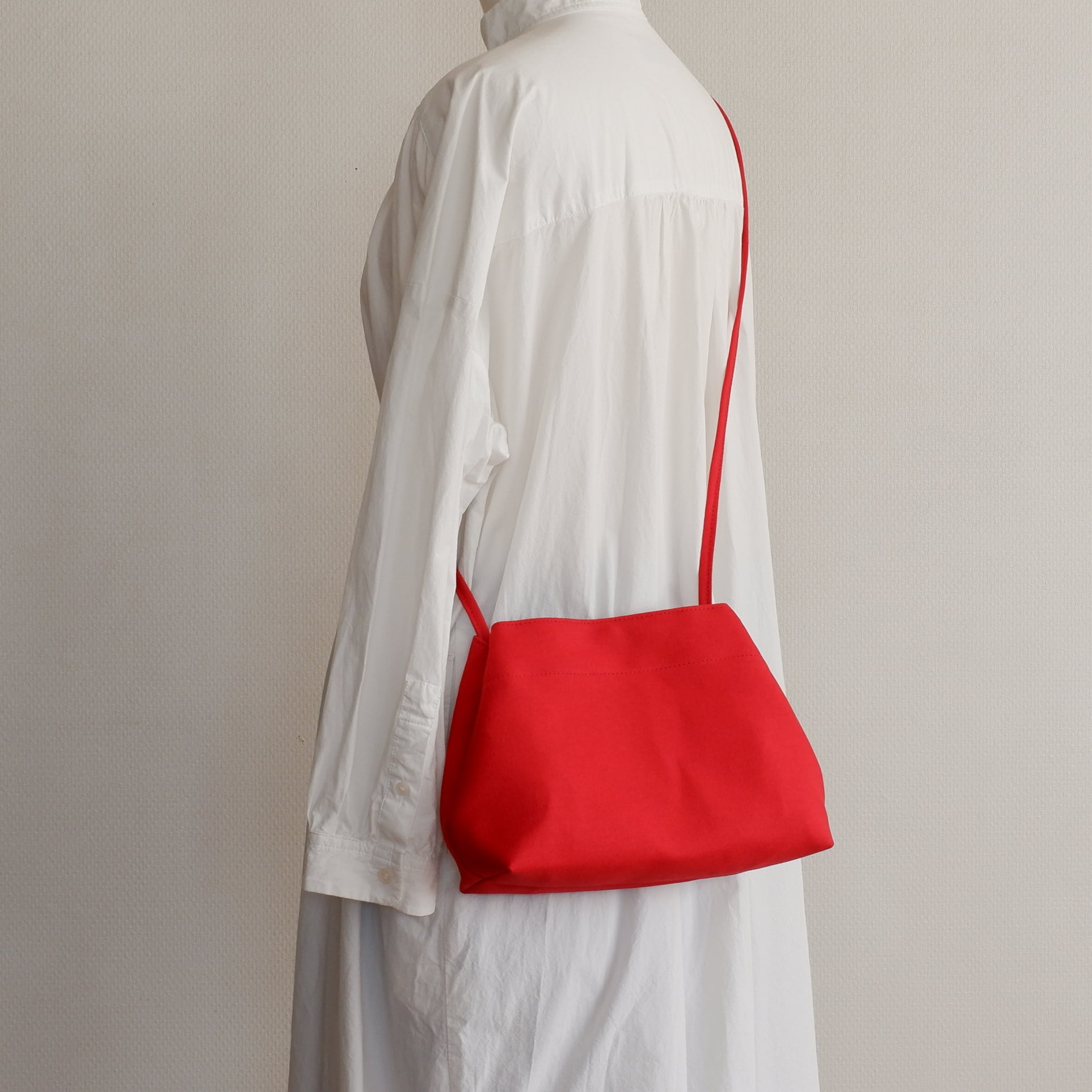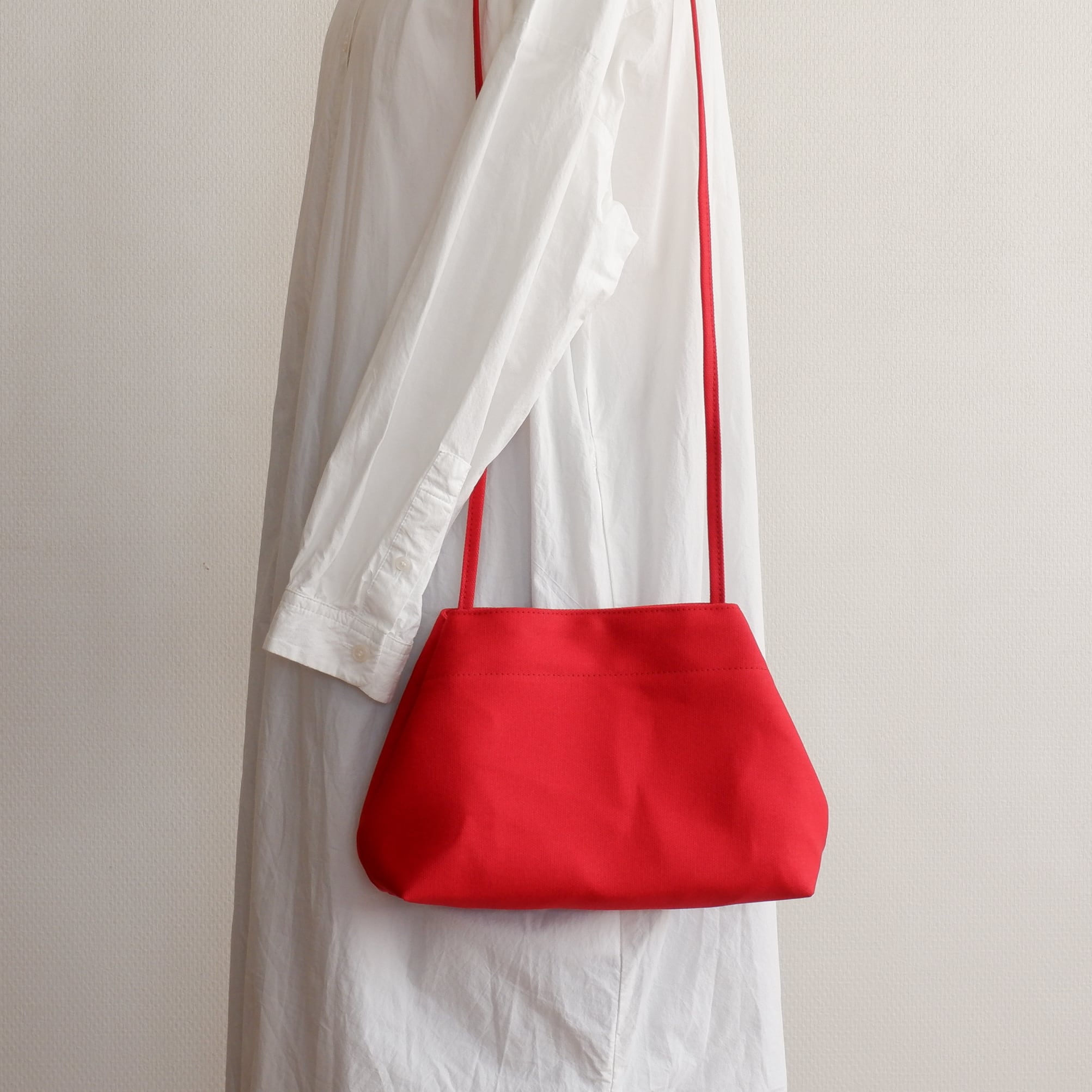 素材は8号の弱撥水加工帆布を使用。柔らかでありつつすこし張りのある質感でしっかりとした素材のため生じるシワが加工帆布の独特の雰囲気を醸し出します。しっかりとしていて柔らかい素材なので体に沿う感じがショルダーバッグとしてお使いいただきやすいと思います。