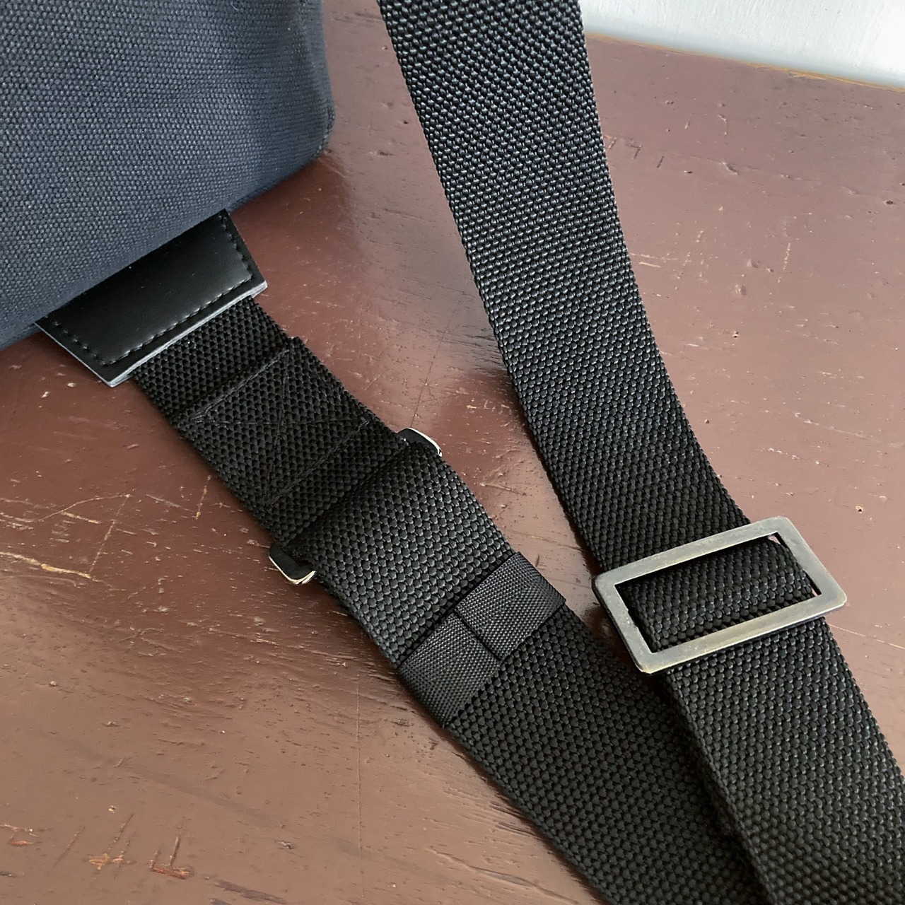 今回の再販よりショルダーストラップと本体を繋ぐ部分が合皮になりました。