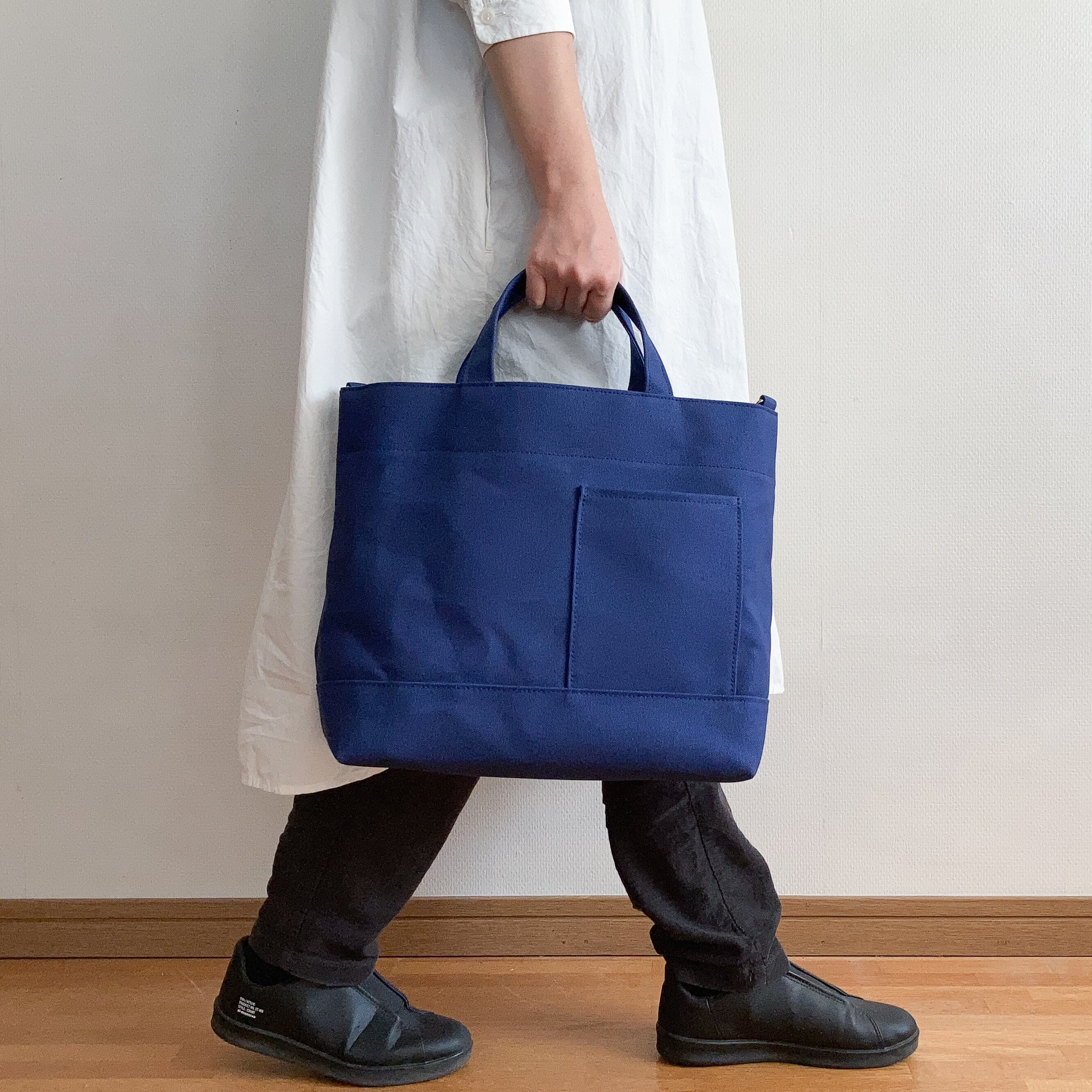 バッグ正面にはスマホなどが入れられるサイズのポケットがあるのがポイントのトート。